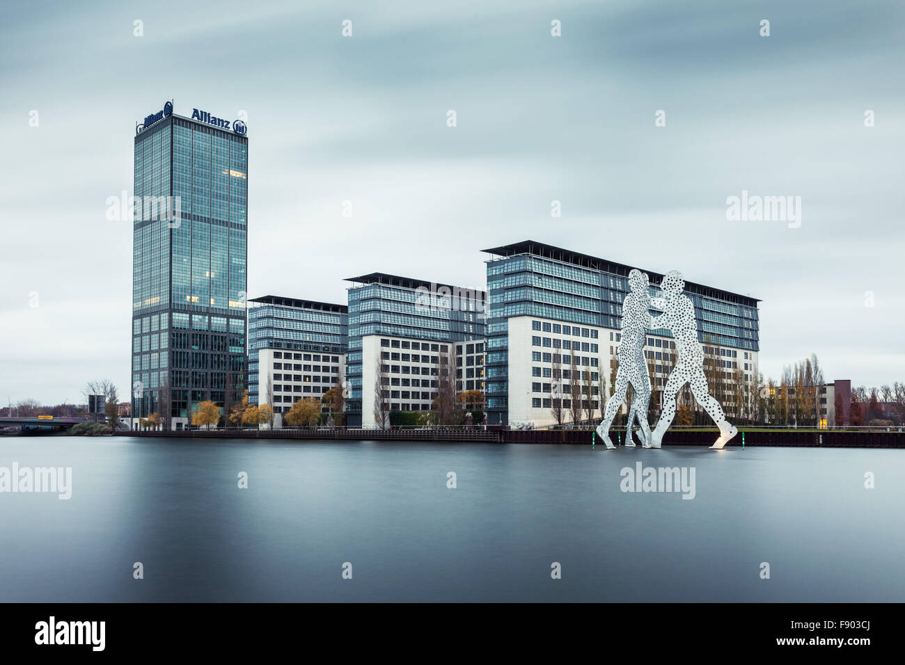 Treptowers Mit Allianz Turm An Der Spree Molecule Man Skulptur Des Kunstlers Jonathan Borofsky Treptow Berlin Stockfotografie Alamy